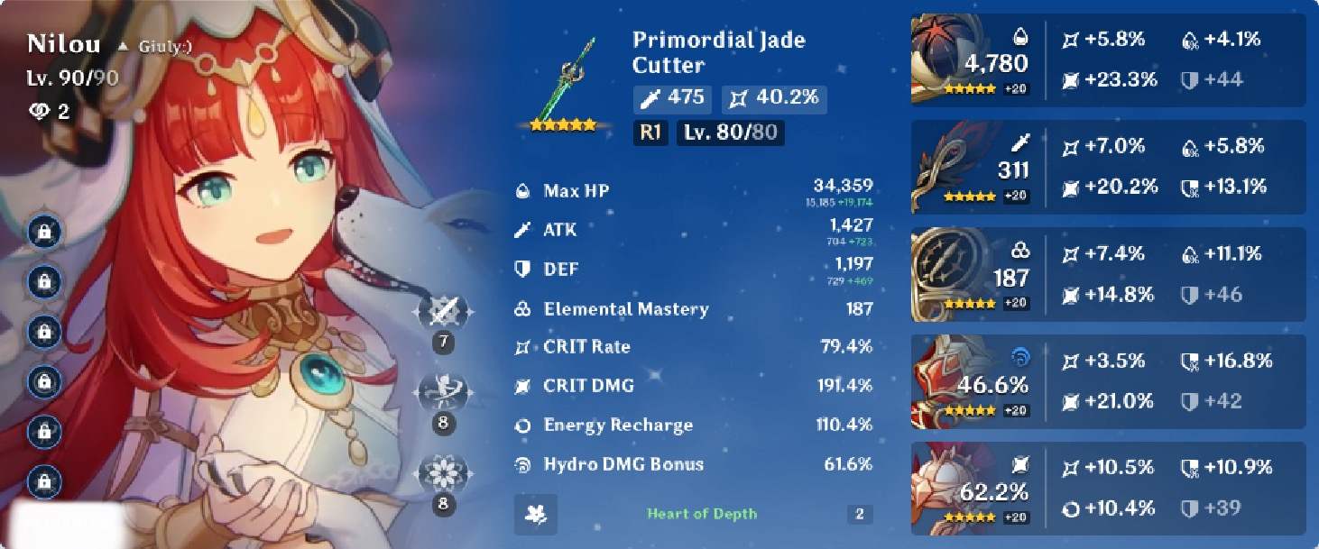 Web Using HP and Hydro DMG pieces players will want to build Nilou using a combination of the Heart of Depth Gilded Dreams and Tenacity of the Millelith artifact. Nilou is a new 5-star Hydro character introduced in Genshin Impact Version 30 and is playable as of Version 31. Web Best Nilou Character Builds There are two ways to focus Nilous equipment.